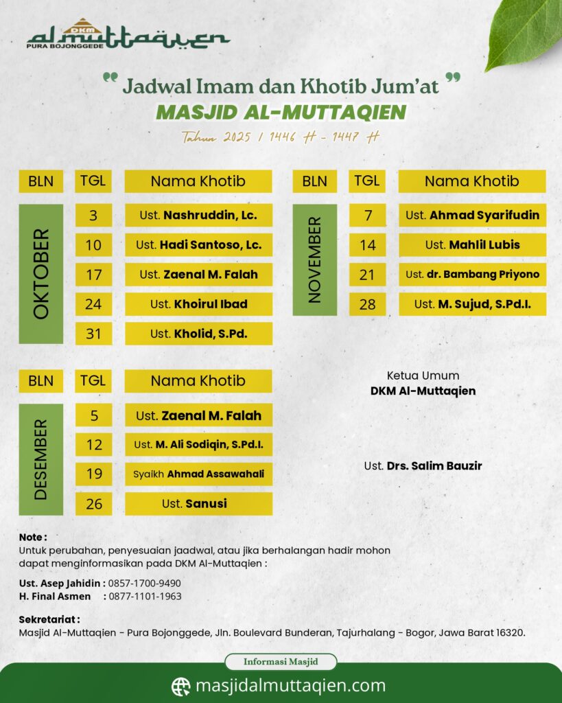 Jadwal Imam dan Khotib Jumat Masjid Al-Muttaqien Tahun 2025 M / 1446 H – 1447 H